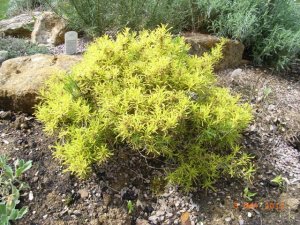 Santolina ‘Lemon Fizz’ is a useful plant in the rock garden. Its vibrant lime green leaves really brighten up the border. In order to keep its colour it is important to cut out the darker green leaves as they show through.